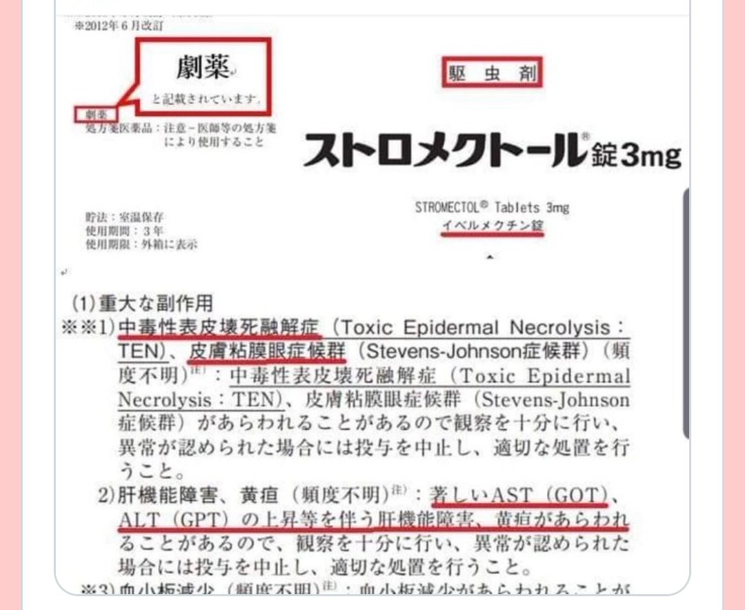 1、在日本的藥物說明中,伊維菌素殺蟲劑被稱為劇藥,有毒藥的意思,副作用很強,引發表皮壞死,肝機能障害等等