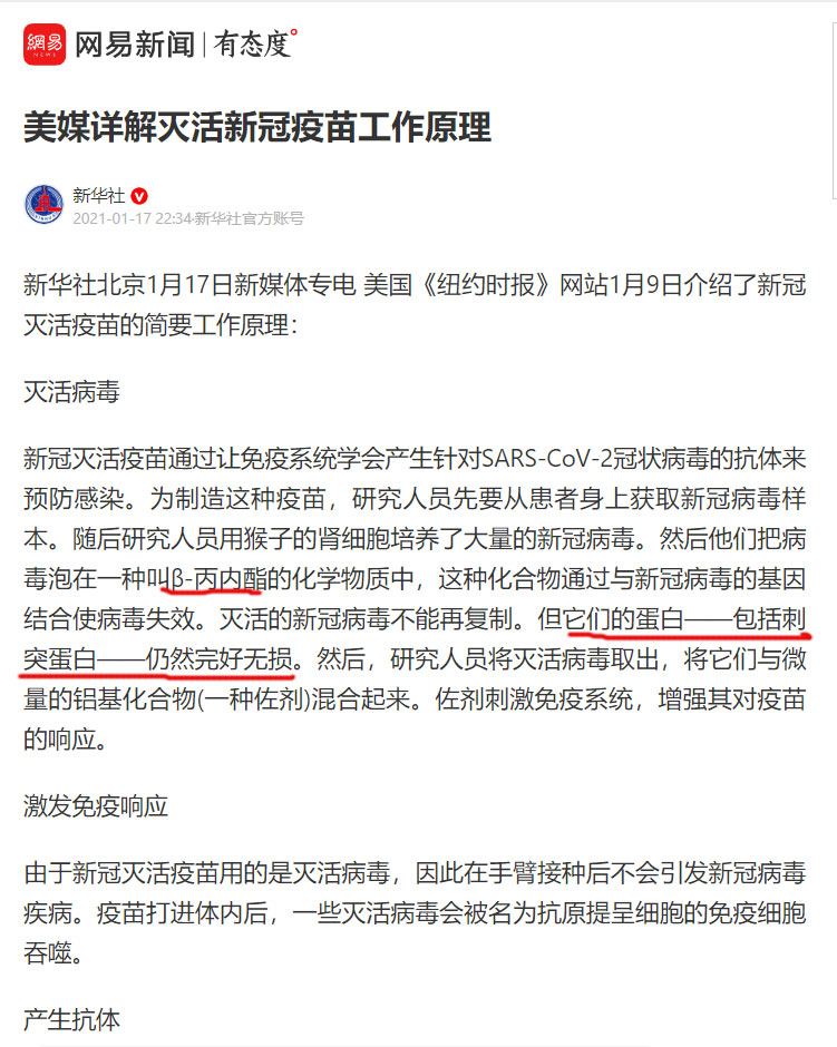 《新华社》北京2021年1月17日新媒体专电 美国《纽约时报》网站1月9日介绍了新冠灭活疫苗的简要工作原理