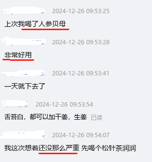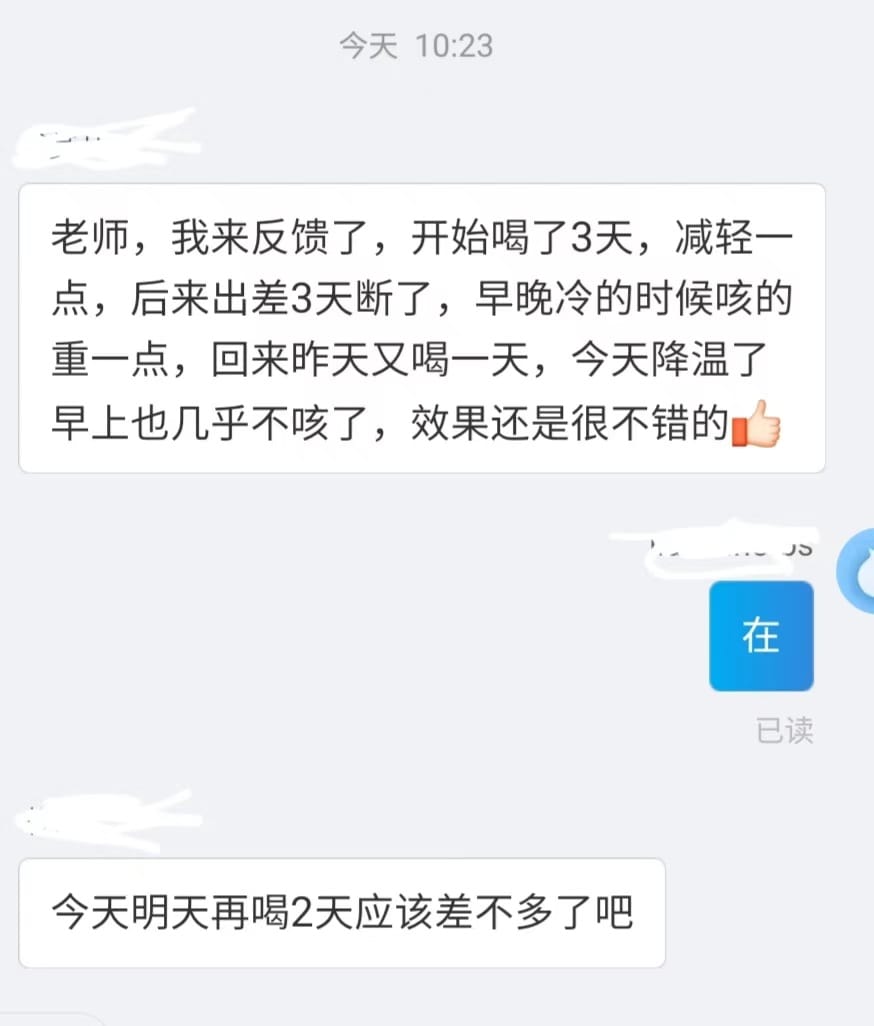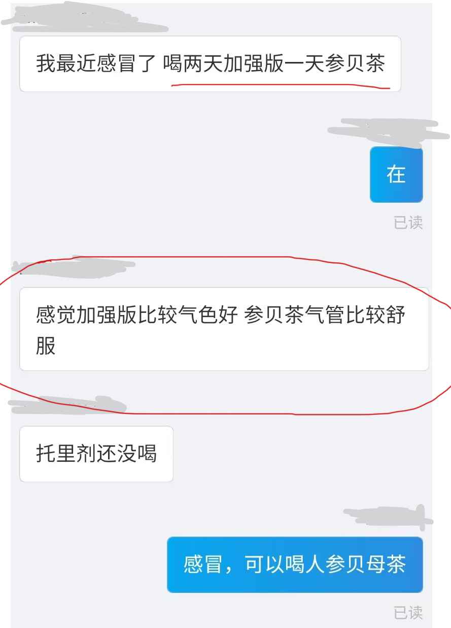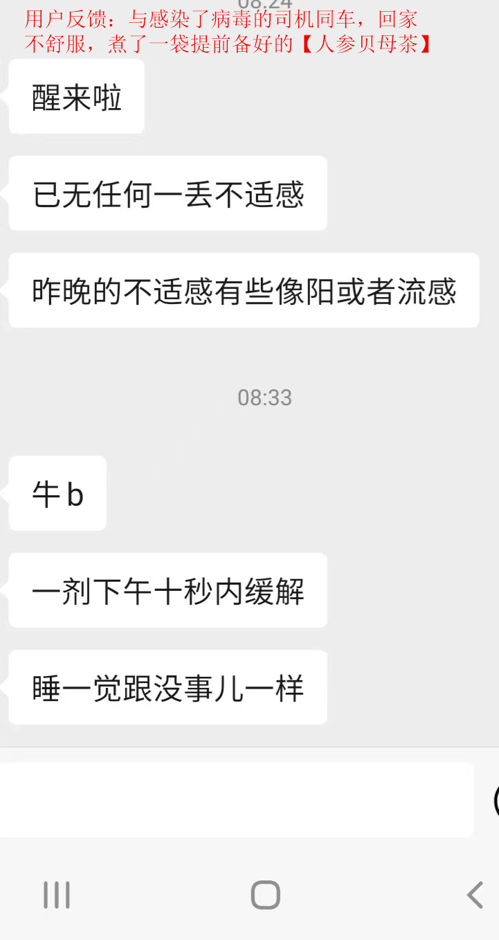2、这位网友,阳了半年,胸口沉,经常咳嗽,喝了4袋人参贝母茶的反馈。