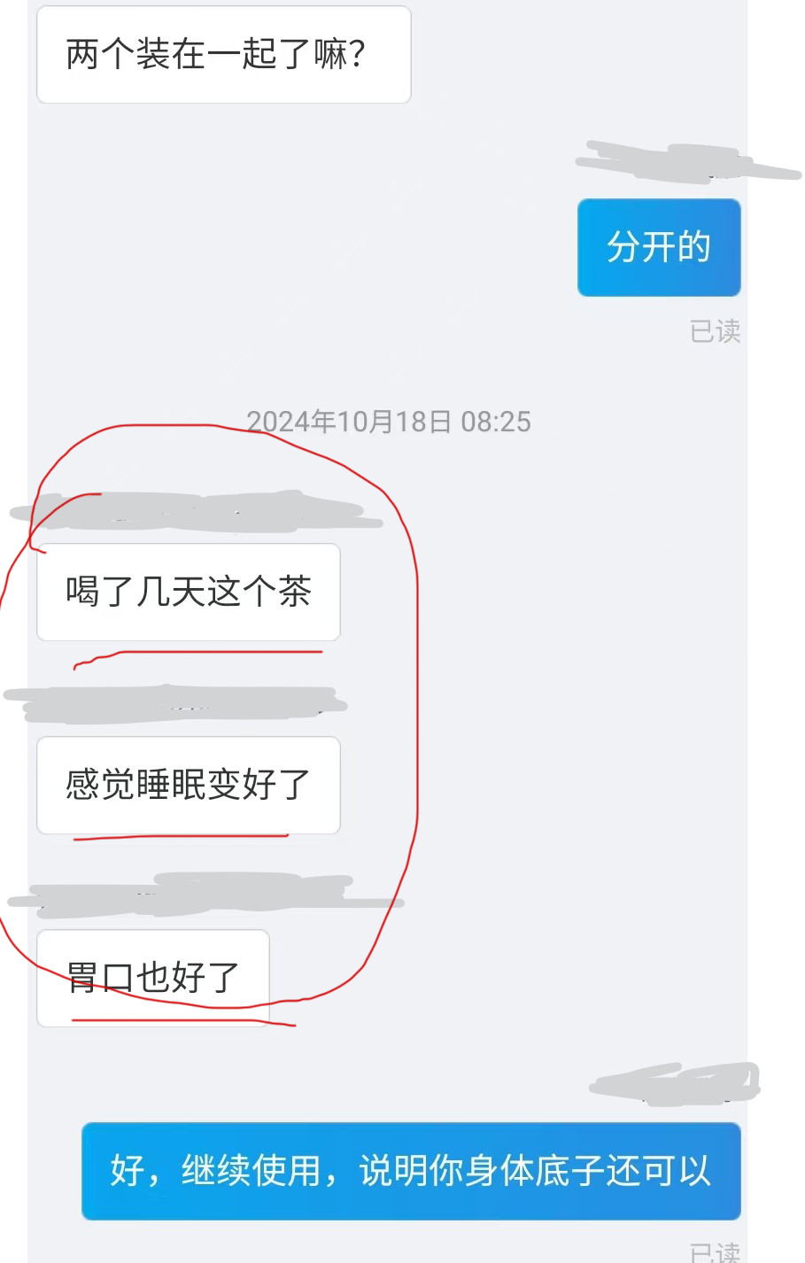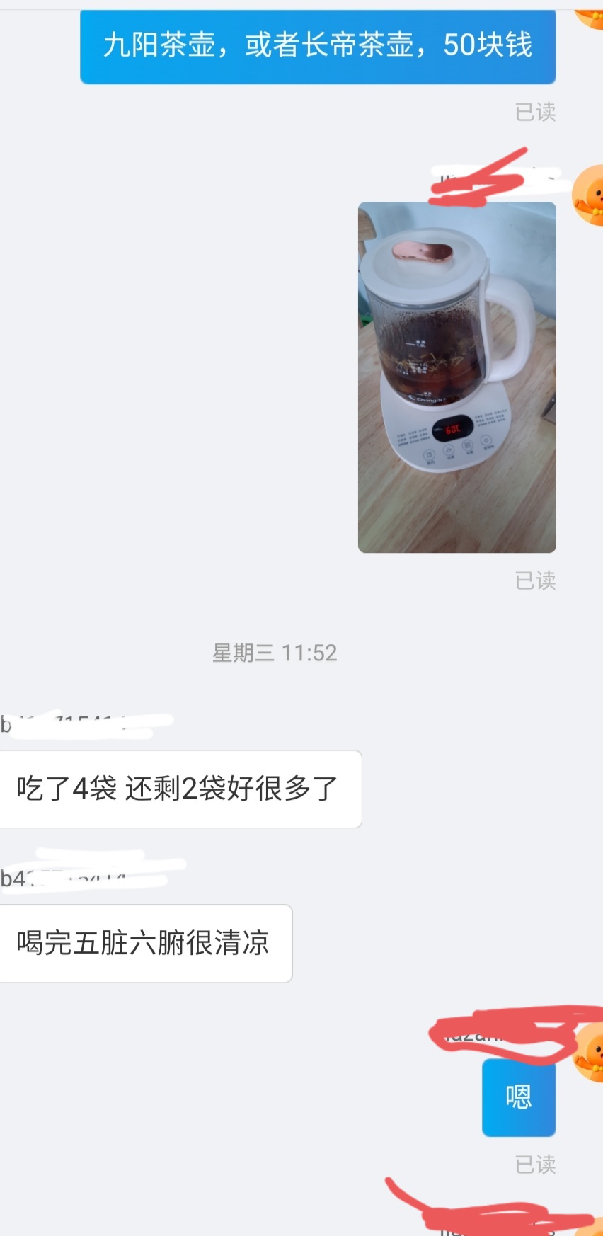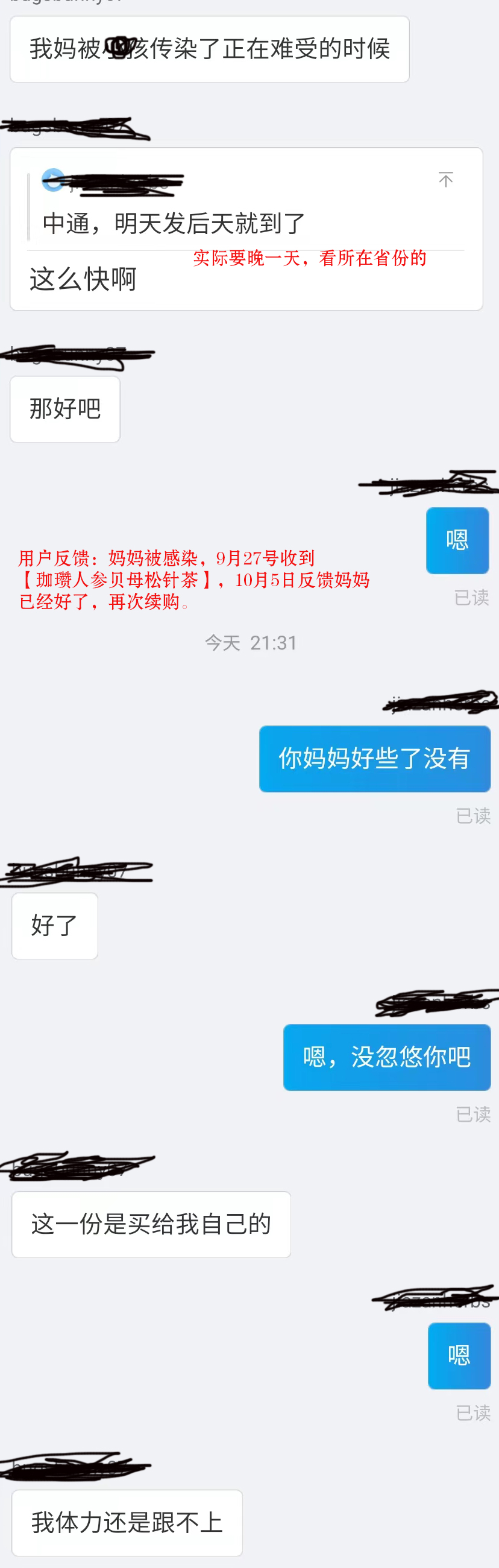 2、这位网友,阳了半年,胸口沉,经常咳嗽,喝了4袋人参贝母茶的反馈。
